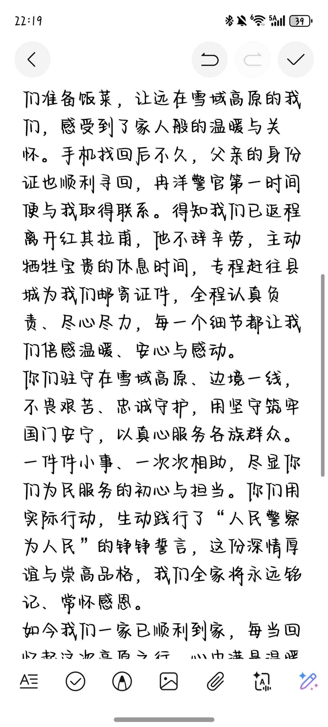 次日,民警在工作过程中又捡到了乔女士父亲的身份证。得知他们已经返程,民警主动放弃休息时间,专程赶到县城将证件寄出。子在回到家中后,乔女士通过微信向民警发来感谢信。她在信中写道:“你们用实际行动,生动践行了‘人民警察为人民’的铮铮誓言,这份深情厚谊与崇高品格,我们全家将永远铭记、常怀感恩。”(盛广淳)